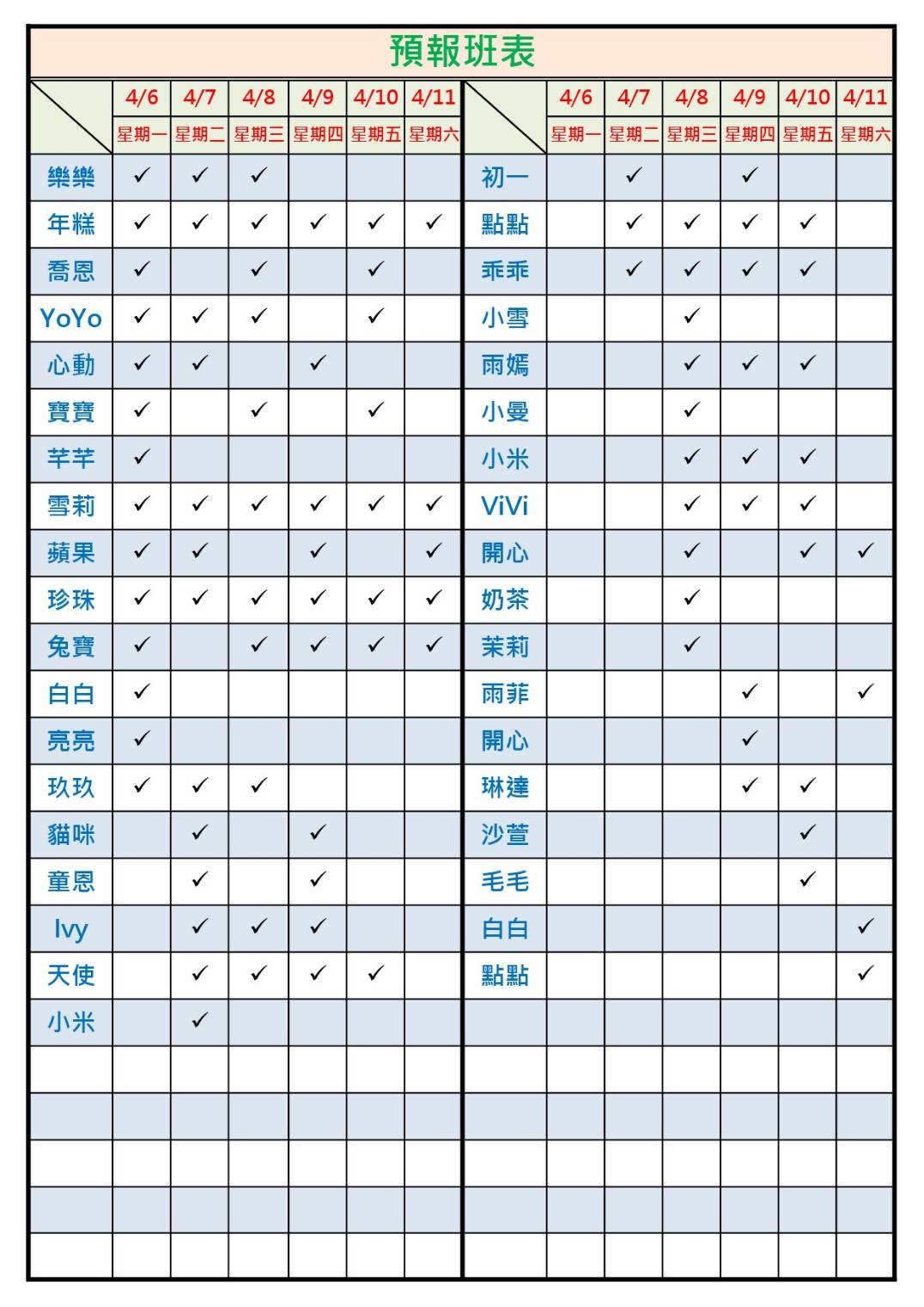 花中花班表